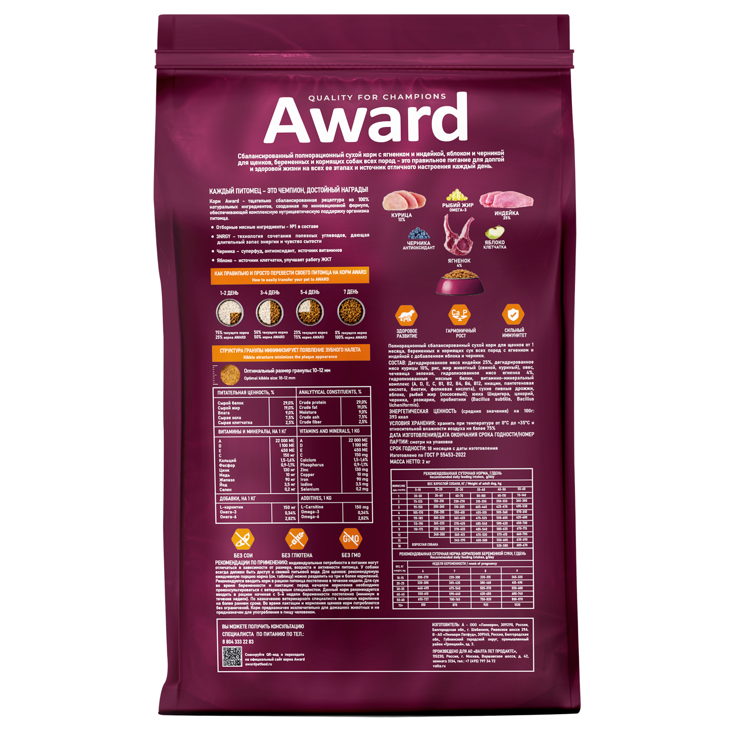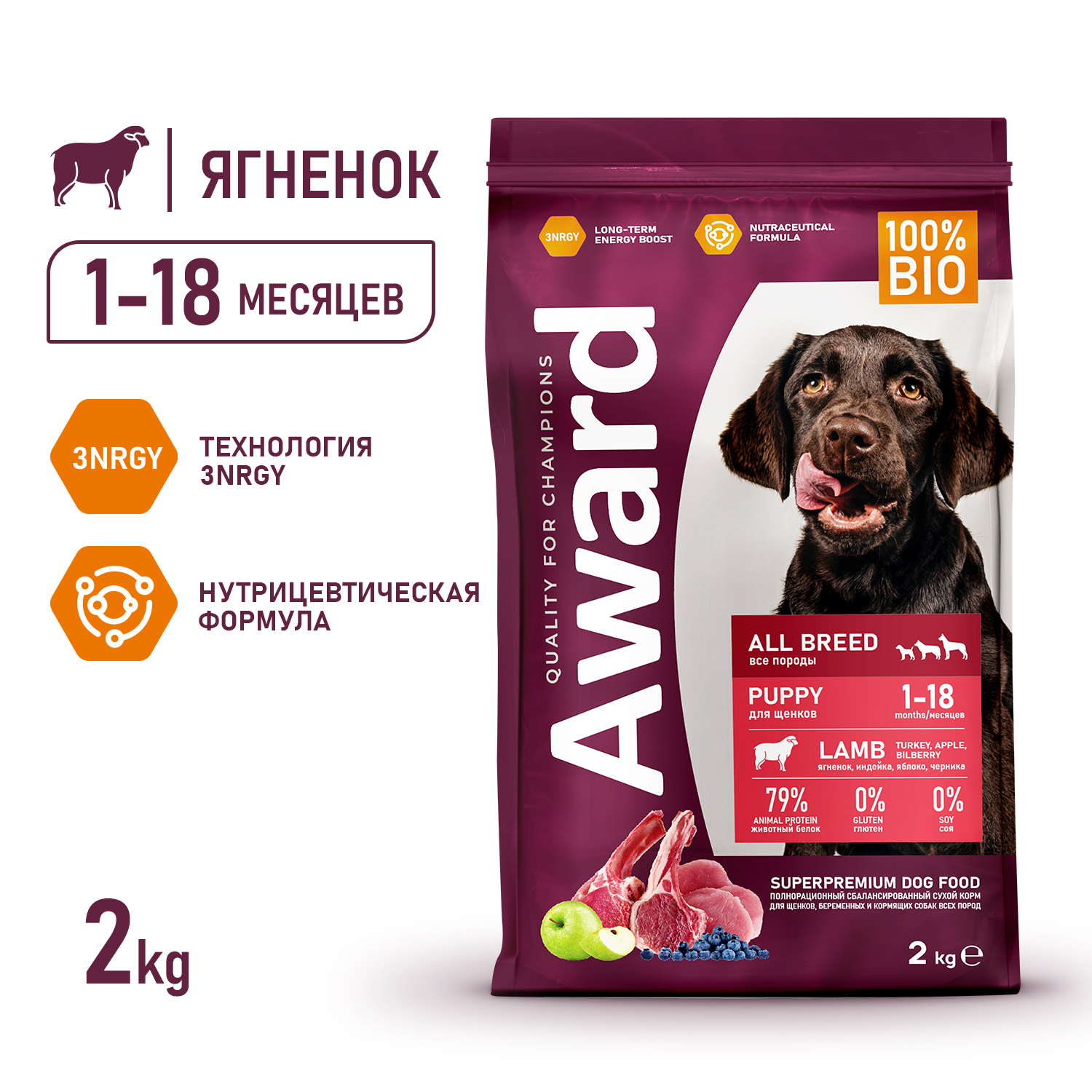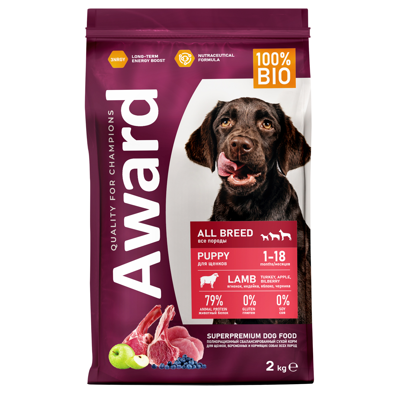 Сухой корм AWARD для щенков от 1 месяца, беременных и кормящих собак всех пород с ягненком и индейкой, обогащенный яблоком и черникой, 2 кг.